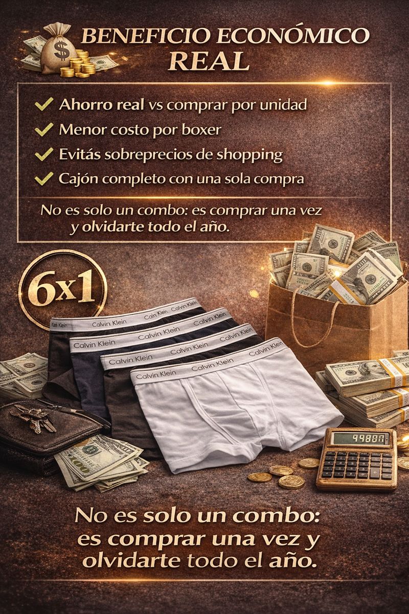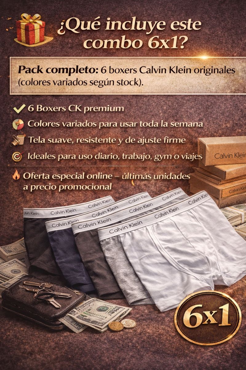 6 Boxers Calvin Klein premium para renovar todo tu cajón en un solo click. Más ahorro, más rotación, más confort. Por tiempo limitado.